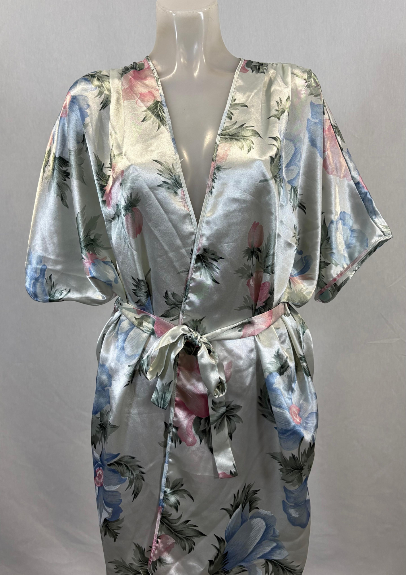 Bata satinada de seda con estampado floral y cinturón ajustable que combina elegancia y comodidad para los momentos de descanso en casa.