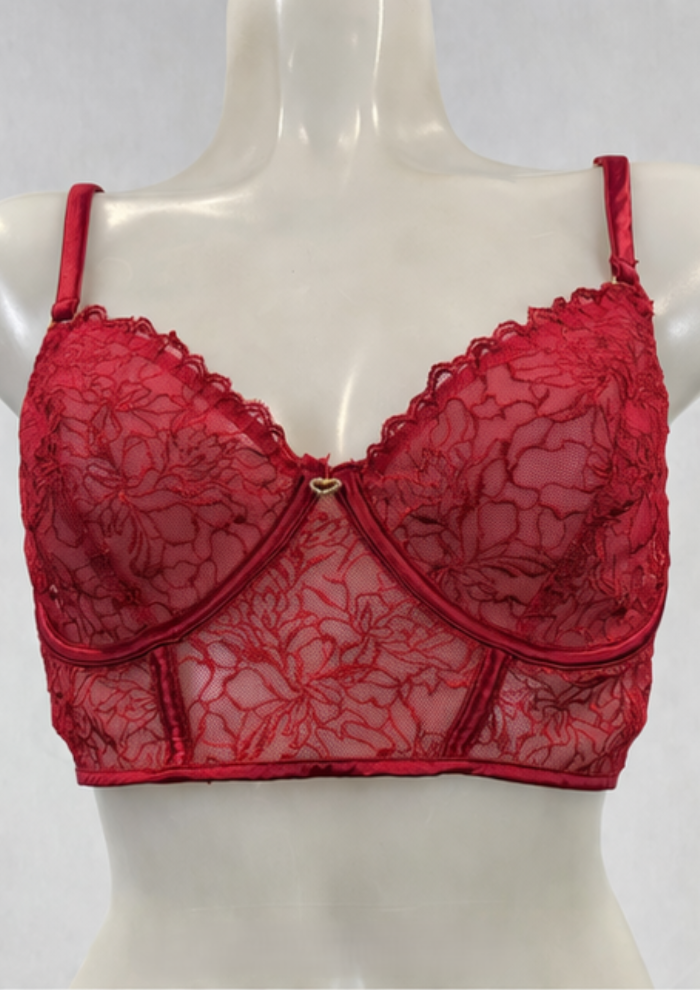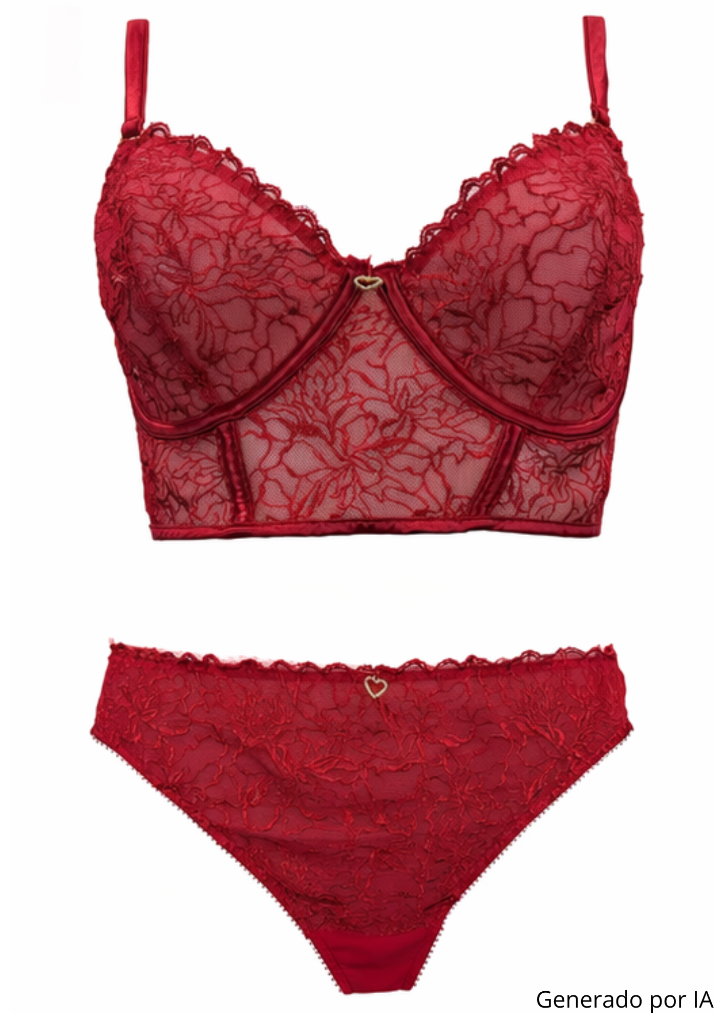 Conjunto de lencería roja de encaje con sujetador y braga de estampado floral. Ambos con un pequeño corazón en el centro.