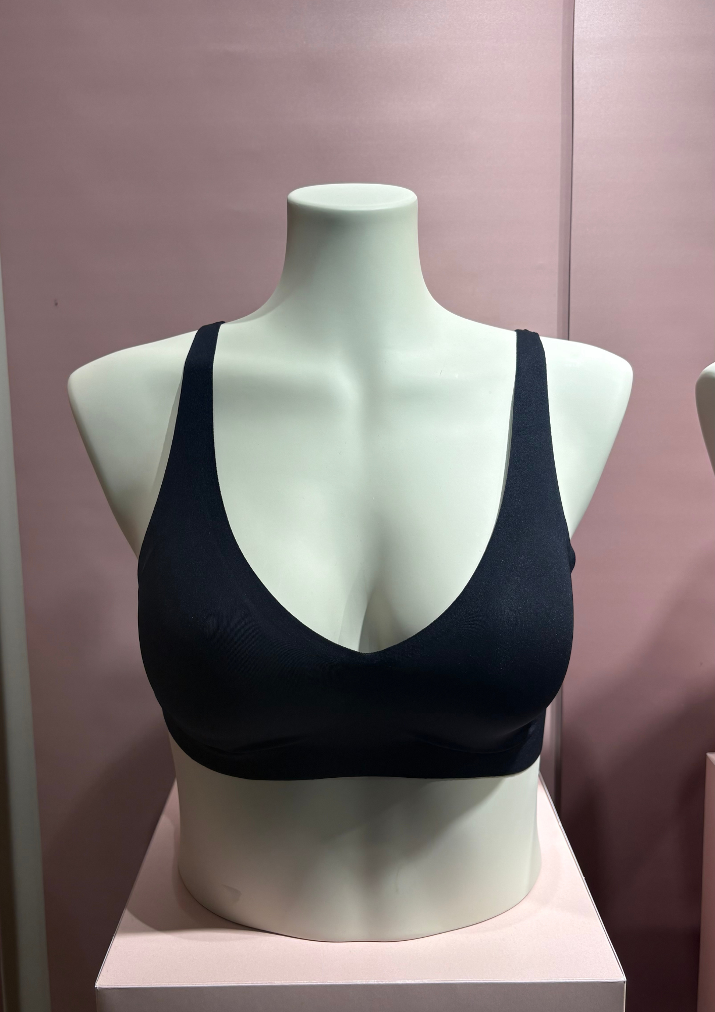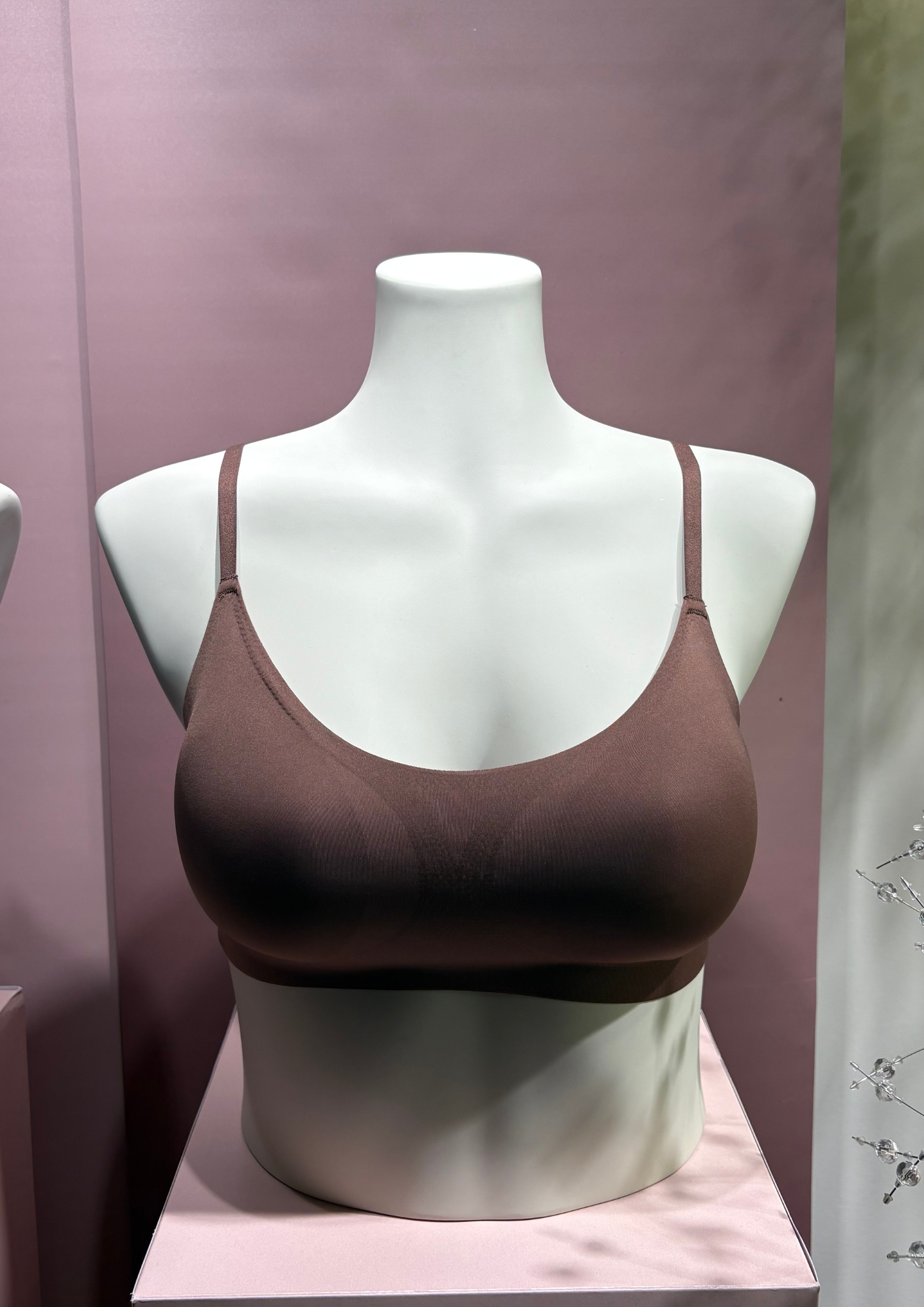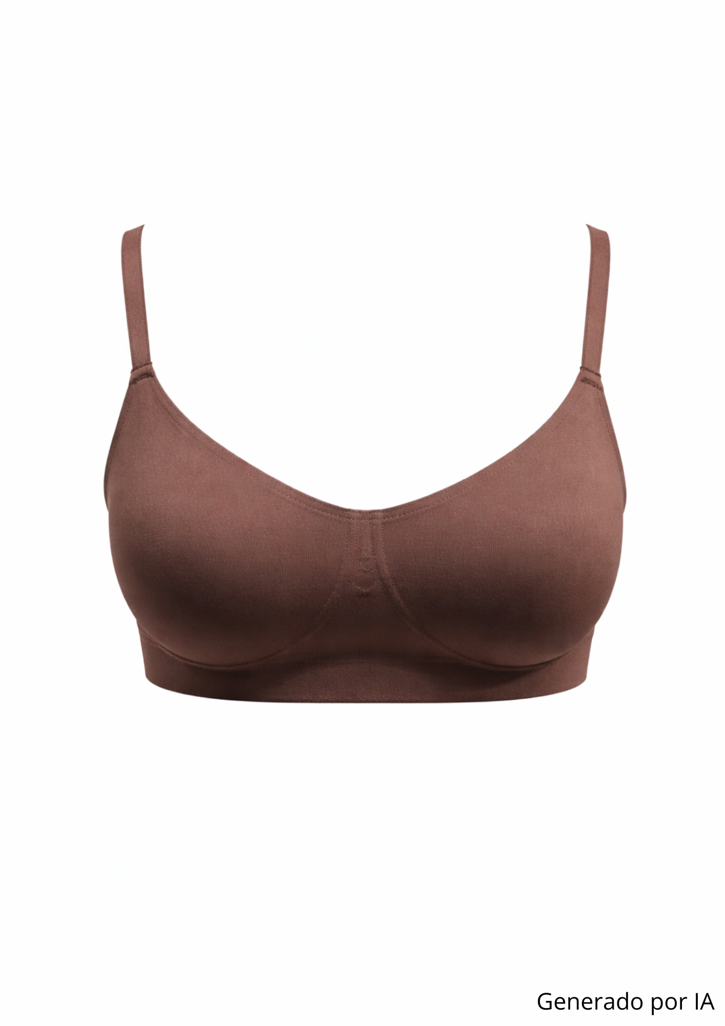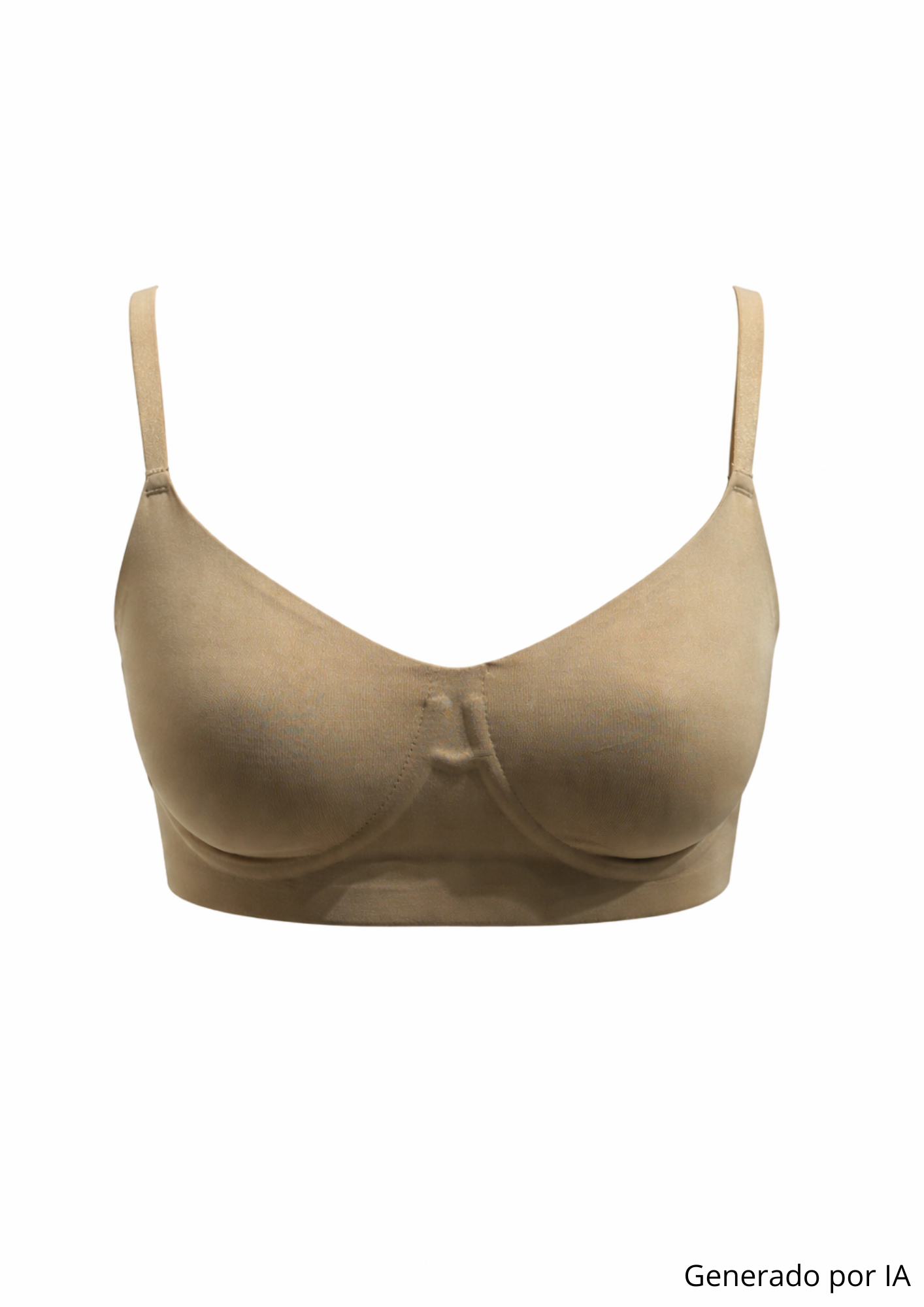 Sujetador seamless beige de diseño minimalista confeccionado en tejido suave y elástico que se adapta al cuerpo para ofrecer comodidad y sujeción ligera en el día a día.